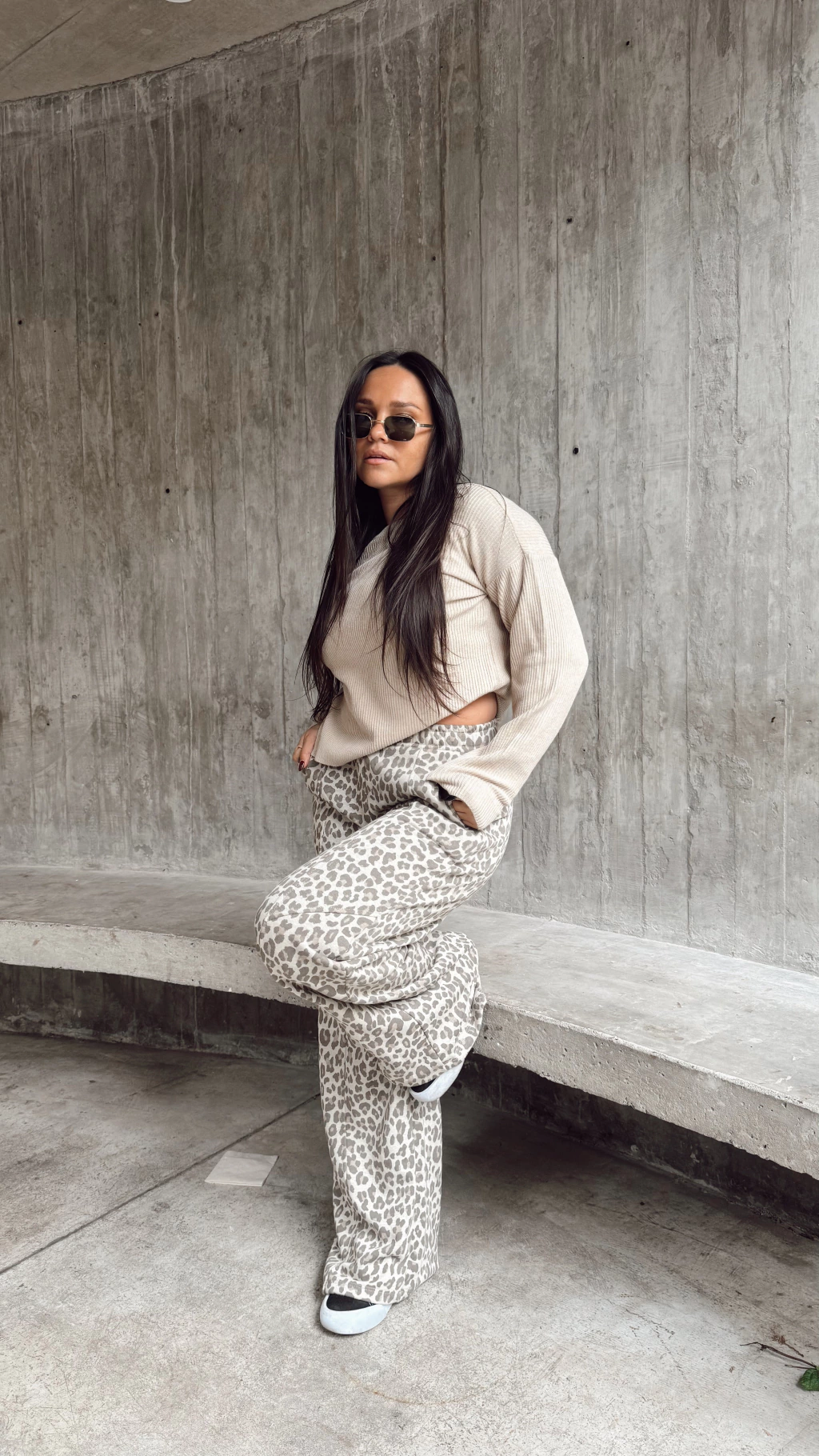 Pantalón de corte holgado con estampado animal print tipo leopardo en tonos beige claro y gris. El diseño de pierna ancha y caída recta aporta una silueta relajada y cómoda. La tela parece suave y flexible, ideal para looks casuales con un toque moderno. El estampado neutro combina fácilmente con prendas superiores en tonos tierra o colores sólidos, manteniendo un estilo urbano y chic.